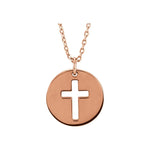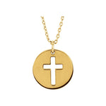 This necklace features a delicate disc with a pierced cross, inspired by Hebrews 11:1, "Now faith is the assurance of things hoped for, the conviction of things not seen."