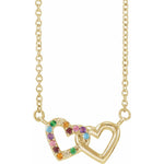Crafted with care, this necklace features two hearts linked together, one adorned with a vibrant rainbow gemstone, reflecting the promise of God's covenant as described in Genesis 9:13. Embrace the enduring power of love with this timeless piece, radiating joy and hope in every wear.